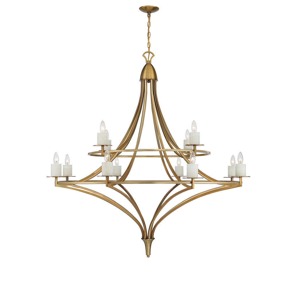 Large in size and bold in style, the Savoy House Director 12-light chandelier is perfectly suited to brighten and embolden bigger spaces. We took classic chandelier style and added a natural twist by using pieces of genuine stone for the candle sleeves. The white stone and the warm brass finish are a perfect match. Director is 50" in height and 50" in width. It uses twelve standard size bulb of up to 60 watts per bulb. Comes with 120" of chain and 144" of cord.