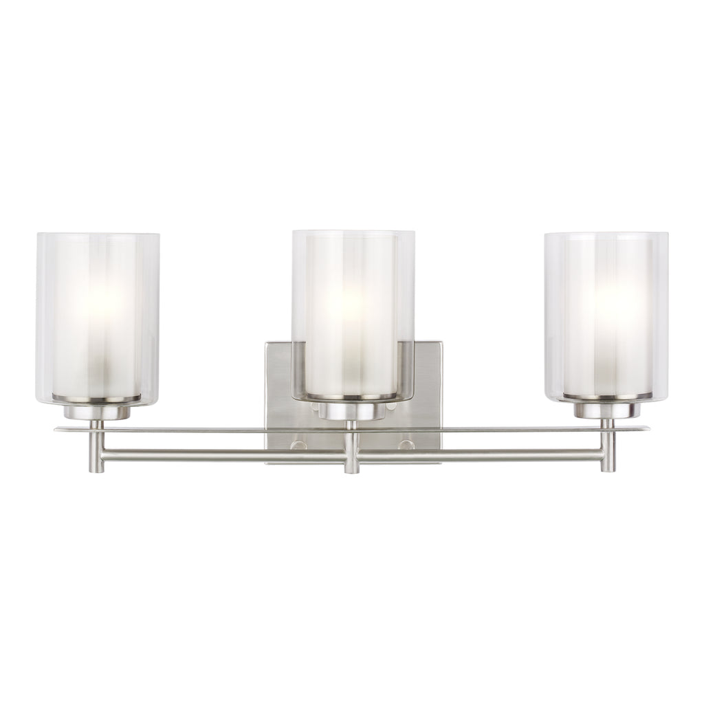 The Elmwood Park three light vanity fixture in brushed nickel offers shadow-free lighting in your powder room, spa, or master bath room. Elmwood Park by has clear glass tube shades with an inner white glass element that softens the light and helps cast an even glow. A cylinder of etched glass is centered within a larger cylinder of clear glass which encircles each light bulb to create this stunning visual effect. The full assortment includes three-, five-and nine-light chandeliers, a four-light linear, one-light mini pendant, a three-light pendant, a two-light semi flush which is convertible into a pendant, and one-, two-, three- and four-light bath fixtures. All fixtures offered in either a Brushed Nickel or Brushed Oil Rubbed Bronze. Incandescent and ENERGY STAR-qualified LED lamping are available, all fixtures are California Title 24 compliant.