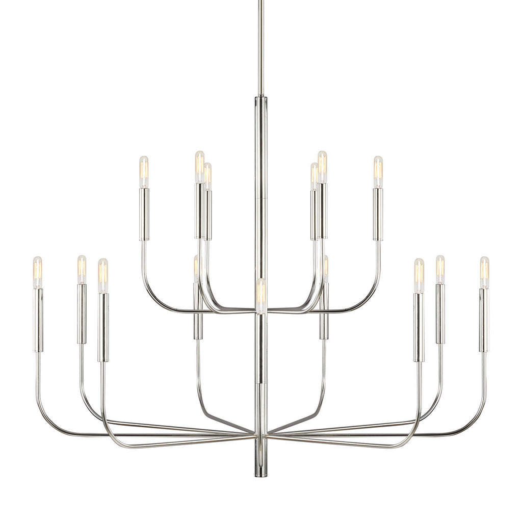 The Brianna fifteen light multi-tier chandelier in polished nickel has graceful, seamless curvature and elongated tubular arms that lend fluidity and modern appeal to this classic minimalist silhouette. Also available in Polished Nickel finish , this chandelier comes in six, nine and fifteen light options. Includes one six-inch and four twelve-inch downrods to customize length. Canopy: 5.5 inch diameter. Damp location rated.