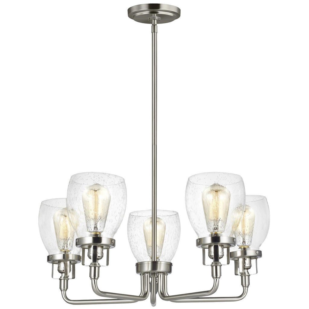 The Belton five light single tier chandelier in brushed nickel is the perfect way to achieve your desired fashion or functional needs in your home. Influenced by the vintage industrial designs of early 20th Century America, the transitional Belton lighting collection has seeded glass shades and Midnight Black finish, adding a layer of retro design to the warm look.