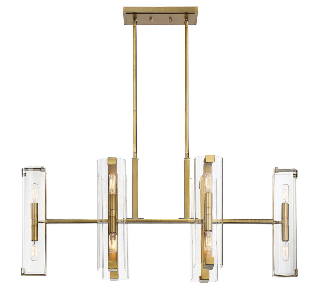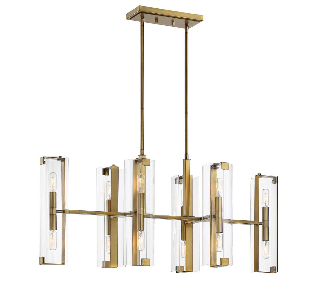 Sleek and sophisticated! The Savoy House Winfield 12-light linear chandelier has an eye-catching design, yet the clean lines and transparent glass keep the mood serene. Bold straight lines of the downrod, frame and bulb sockets are highlighted by a warm brass finish. Each of the six light arms holds two 60W candelabra size bulbs, one facing up and one facing down, for splendid illumination through the pristine clear glass shades. This linear chandelier measures 38" long and 17.25" high. With included 30 degree swivel and extension rods, it has an up to 69.25" hanging height and accommodates sloped ceilings. Overall, it's a chic and stylish fixture for your dining room, living room, entryway, kitchen island, family room, bar, office or media room.