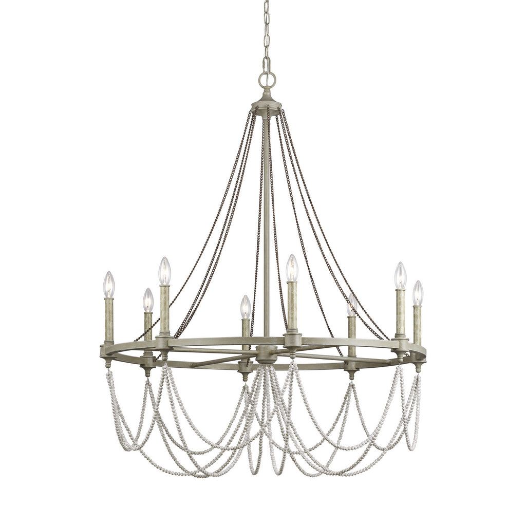 The Sean Lavin Beverly eight light single tier chandelier in French washed oak / distressed white wood supplies ample lighting for your daily needs, while adding a layer of today's style to your home's décor. The Beverly Collection features a stunning combination of rustic, time-worn finishes like Distressed White Wood on the cascading beads, our vintage-inspired French Washed Oak finish on the frame and candle tubes, and Weathered Iron on the chain. Together these elements create a warm, and elegantly simple update to these traditionally-styled fixtures.